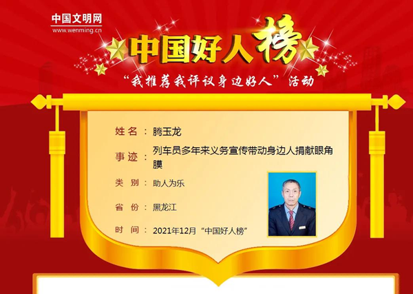 黑龍江經(jīng)濟(jì)網(wǎng)訊(顧澤怡 記者仉慶華)近日,中央文明辦發(fā)布2021年12月“中國好人榜”,鐵力市鐵力鎮(zhèn)居民騰玉龍榮獲助人為樂類“中國好人”稱號(hào),這是繼去年8月份該市居民時(shí)春芳上榜后,鐵力市在公民道德建設(shè)典型人物評(píng)選推薦工作中的又一個(gè)新突破。