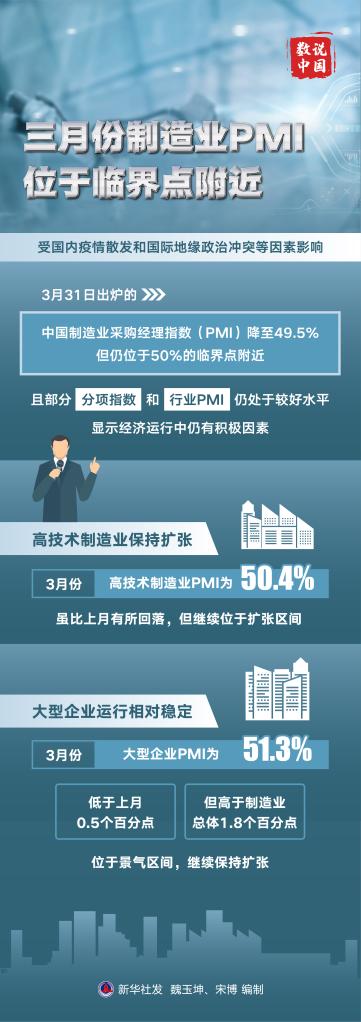新華社北京3月31日電 (記者 魏玉坤)受?chē)?guó)內(nèi)疫情散發(fā)和國(guó)際地緣政治沖突等因素影響,31日出爐的中國(guó)制造業(yè)采購(gòu)經(jīng)理指數(shù)(PMI)降至49.5%,但仍位于50%的臨界點(diǎn)附近,且部分分項(xiàng)指數(shù)和行業(yè)PMI仍處于較好水平,顯示經(jīng)濟(jì)運(yùn)行中仍有積極因素。