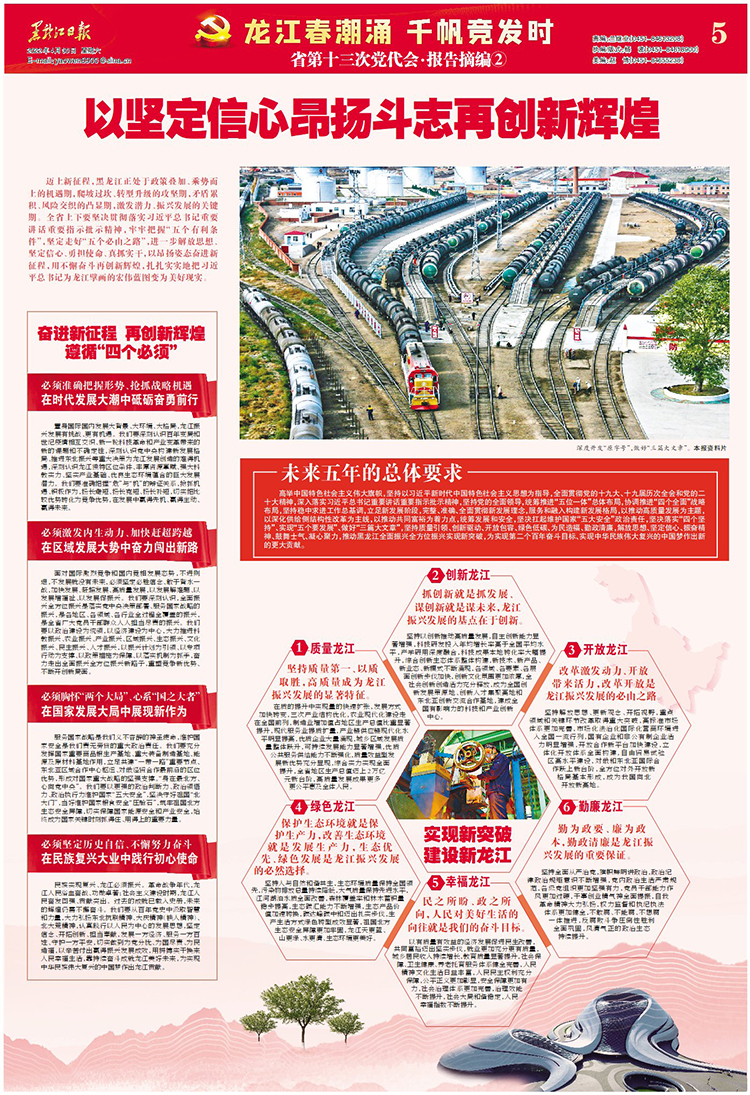 邁上新征程,黑龍江正處于政策疊加、乘勢而上的機遇期,爬坡過坎、轉(zhuǎn)型升級的攻堅期,矛盾累積、風險交織的凸顯期,激發(fā)潛力、振興發(fā)展的關(guān)鍵期。全省上下要堅決貫徹落實習近平總書記重要講話重要指示批示精神,牢牢把握“五個有利條件”,堅定走好“五個必由之路”,進一步解放思想、堅定信心、勇?lián)姑⒄孀嵏?,以昂揚姿態(tài)奮進新征程,用不懈奮斗再創(chuàng)新輝煌,扎扎實實地把習近平總書記為龍江擘畫的宏偉藍圖變?yōu)槊篮矛F(xiàn)實。