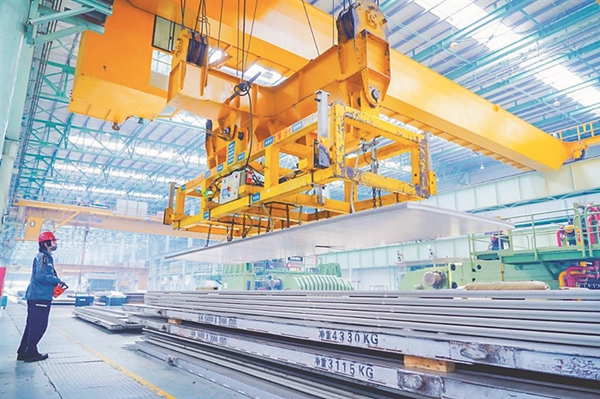 生產(chǎn)人員對(duì)軋制完成的鋁板進(jìn)行吊運(yùn)。 黑龍江日?qǐng)?bào)全媒體記者 韓麗平攝