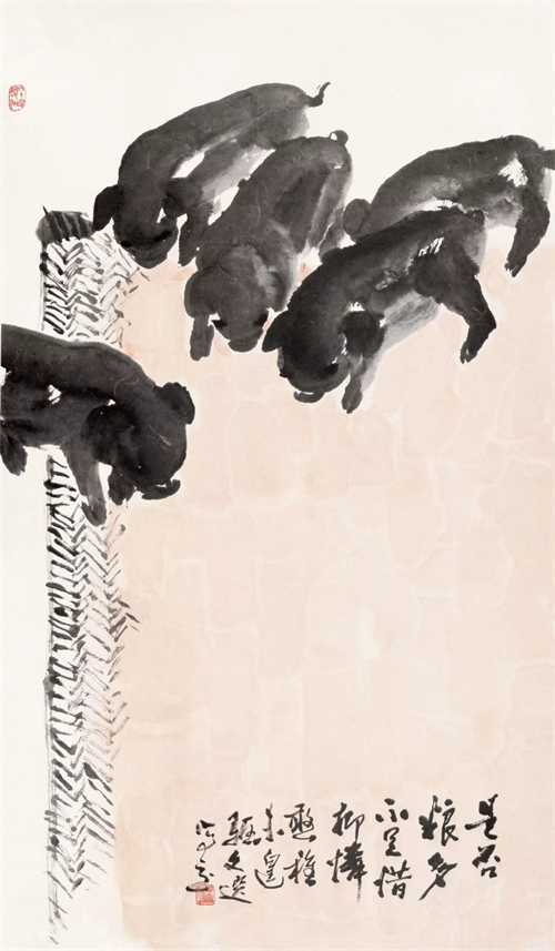 湯文選的人物、山水、花鳥、墨虎等一系列作品,融會(huì)著、貫穿著“三種傳統(tǒng)”?;螂[或顯,或化解之,或凝聚之,或熔裁之,或獨(dú)造之?!叭N傳統(tǒng)”,可概括為現(xiàn)實(shí)主義在中國畫發(fā)展歷程中的三段式,亦曰交叉出現(xiàn)的不同歷史內(nèi)涵、文化反映的三種藝術(shù)狀態(tài):首先,是古代現(xiàn)實(shí)主義傳統(tǒng)——“外師造化,中得心源”。其二,是“五四”現(xiàn)實(shí)主義傳統(tǒng)——融合西法,崇尚寫實(shí)。其三,是新中國成立后倡導(dǎo)的革命現(xiàn)實(shí)主義傳統(tǒng)。深入火熱斗爭,深入工農(nóng)兵。學(xué)習(xí)延安木刻,學(xué)習(xí)民間年畫,學(xué)習(xí)蘇聯(lián)油畫現(xiàn)實(shí)主義的創(chuàng)作方法(50年代)。其后,“一手伸向生活,一手伸向傳統(tǒng)”(60年代)。在以上“三種傳統(tǒng)”的交匯點(diǎn)上,伸延出湯文選早期和中期的現(xiàn)實(shí)主義創(chuàng)作之路。湯文選中國畫藝術(shù)的現(xiàn)實(shí)主義,其主要特征為積極的入世態(tài)度,強(qiáng)烈的人文主義色彩,個(gè)性、民族性與時(shí)代性的完美統(tǒng)一,以及嚴(yán)肅的歷史使命感。