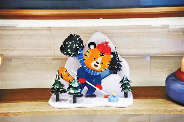 這是學(xué)生們制作的手工藝品“愛(ài)玩冰壺的小老虎”。(胡錫韋/攝)