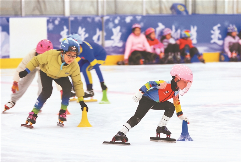 2日,哈爾濱市道里區(qū)冰上運(yùn)動(dòng)中心氣膜冰場(chǎng)內(nèi),百余名中小學(xué)生正在練習(xí)滑冰。