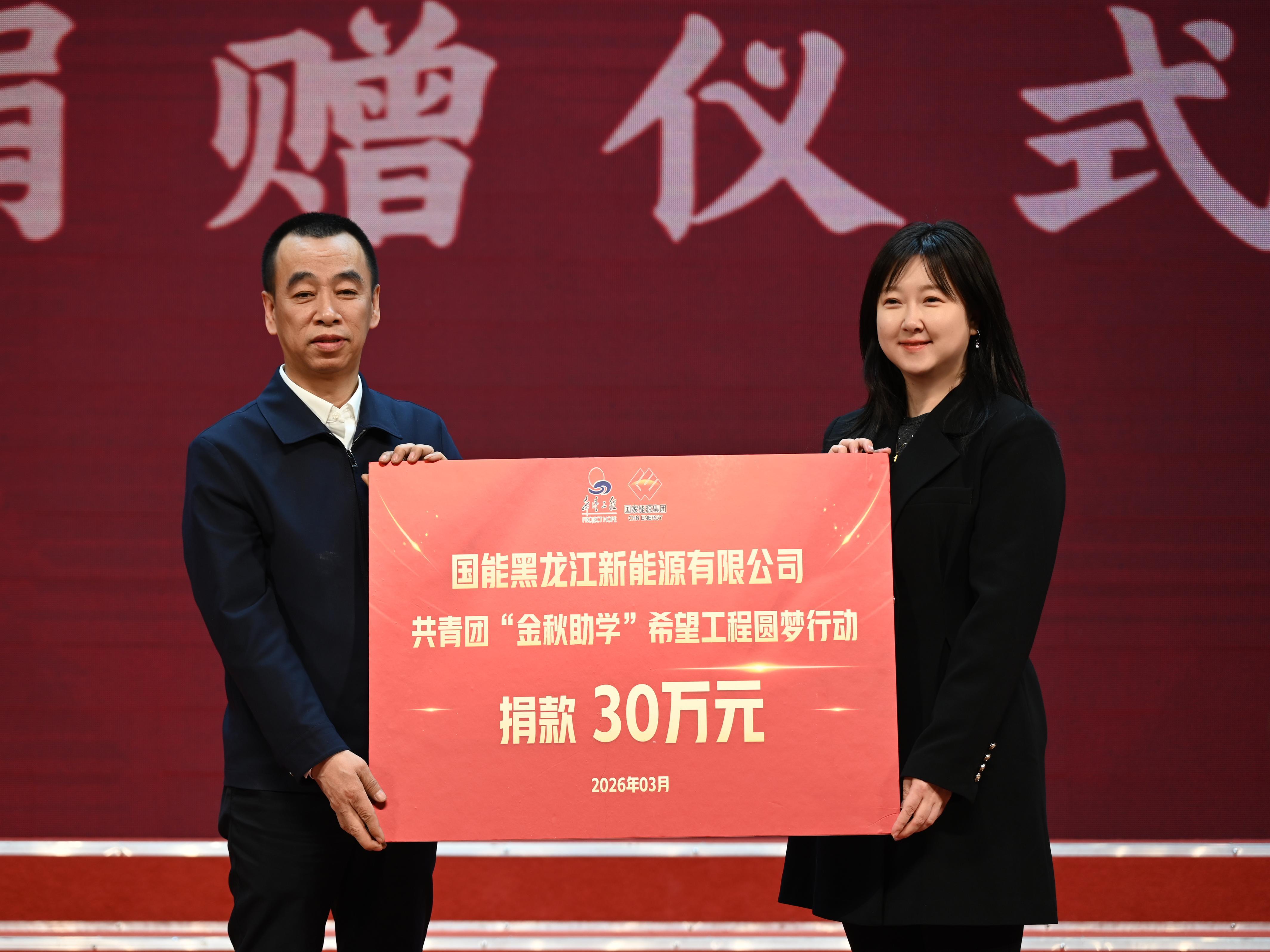 在捐贈儀式上,國能黑龍江新能源有限公司向省青基會捐贈共青團“金秋助學(xué)”希望工程圓夢行動助學(xué)金30萬元。其中,20萬元將專項用于資助全省13個市地、23所技工院校中品學(xué)兼優(yōu)、家庭經(jīng)濟困難的100名學(xué)生,為困境學(xué)子紓困解難,助力他們順利完成學(xué)業(yè)、掌握一技之長,憑借技能實現(xiàn)人生價值、圓人生夢想。